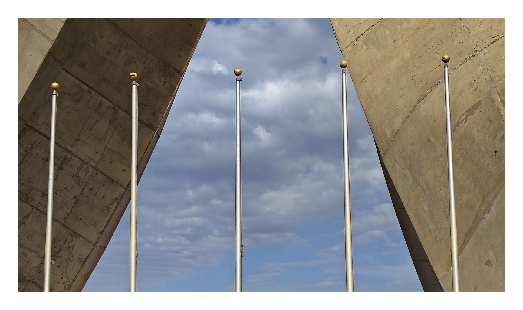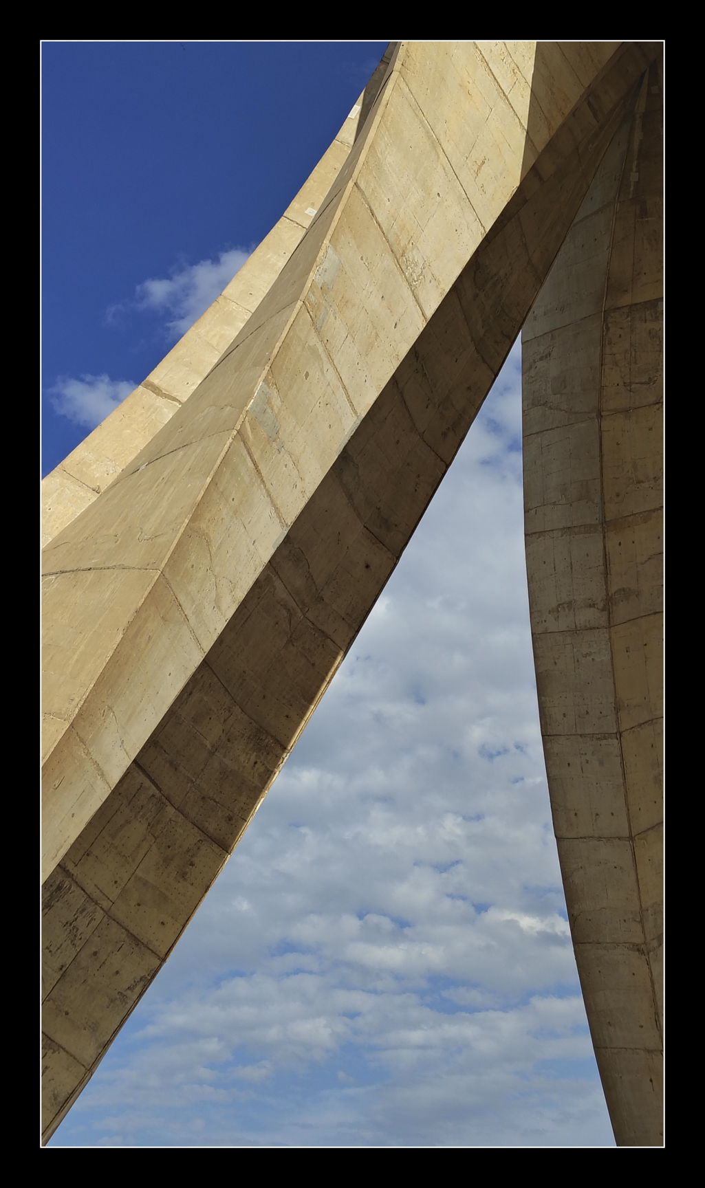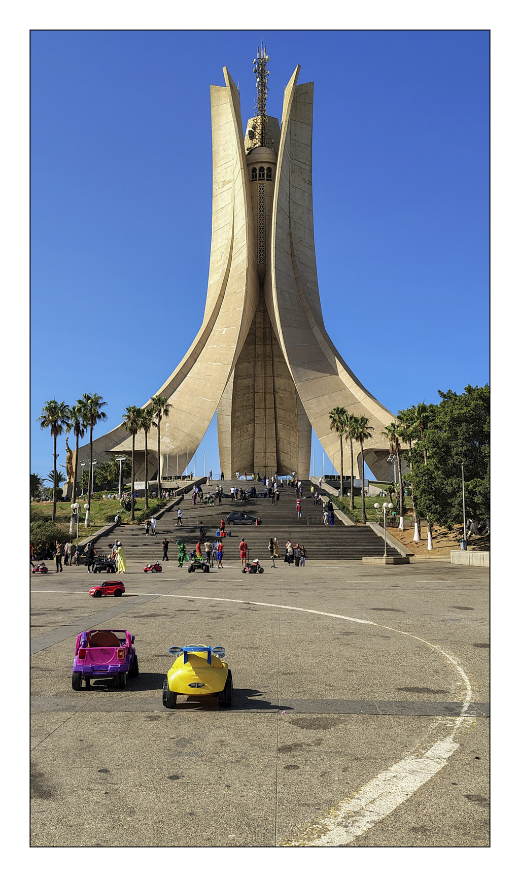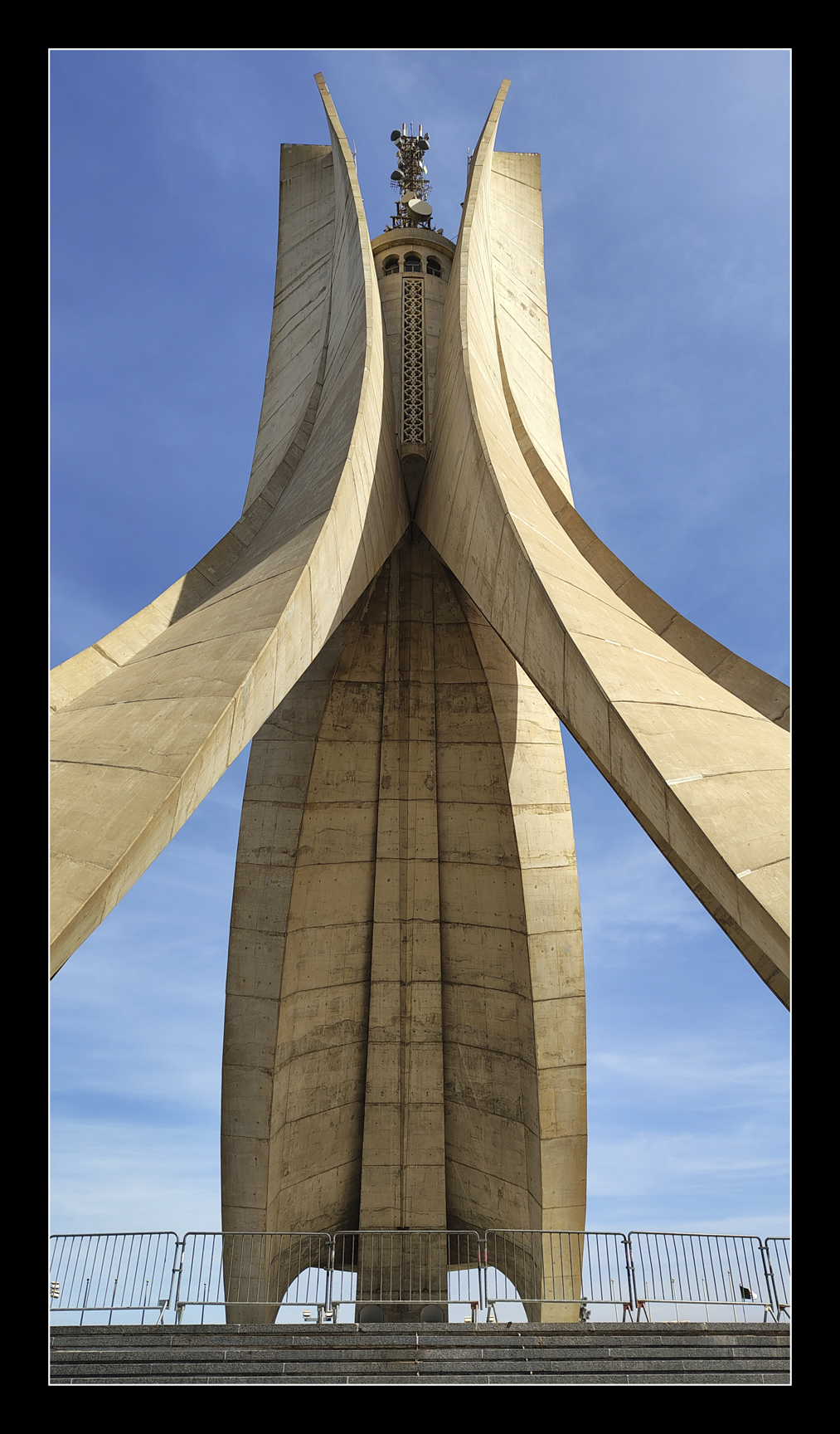 The Maqam Echahid (Martyr’s Memorial) is a concrete monument commemorating all those who died over the decades fighting for Algeria’s independence. The monument was opened on July 5th 1982, on the 20th anniversary of Algeria’s independence. It is fashioned in the shape of three standing palm leaves, which shelter the “Eternal Flame” under it. At the edge of each palm leaf is a statue of a soldier representing a stage of Algeria’s struggle for independence (1). The memorial was built by two Canadian Companies, Fitzpatrick construction and SNC Lavalin.