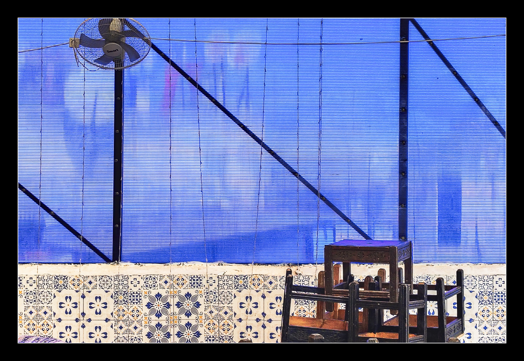 ~ 01 – I have hummed and hawed about this image, and I’m still not sure I like it. The blue screen provides shade on a rooftop cafe that was just about to close when we visited it.