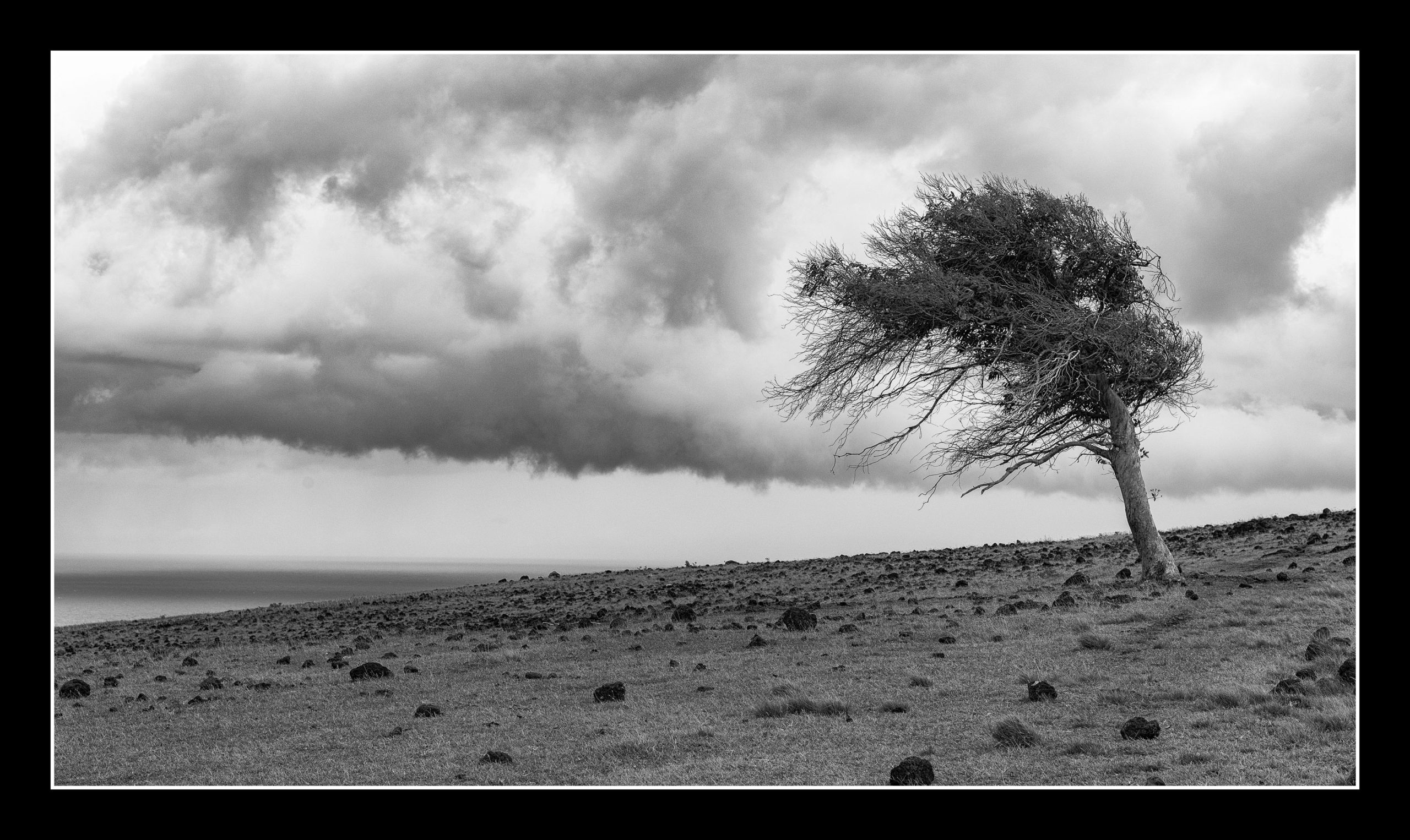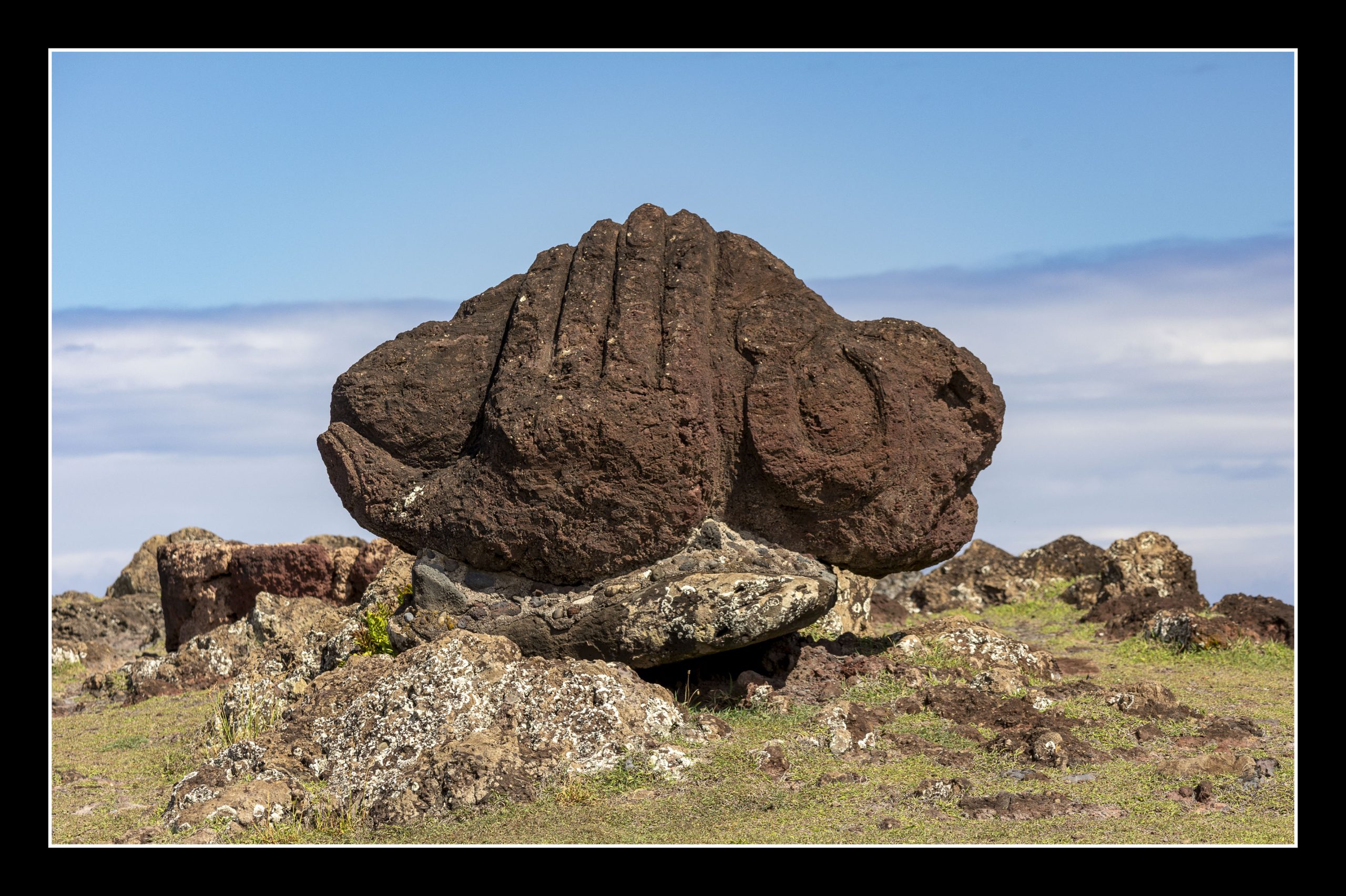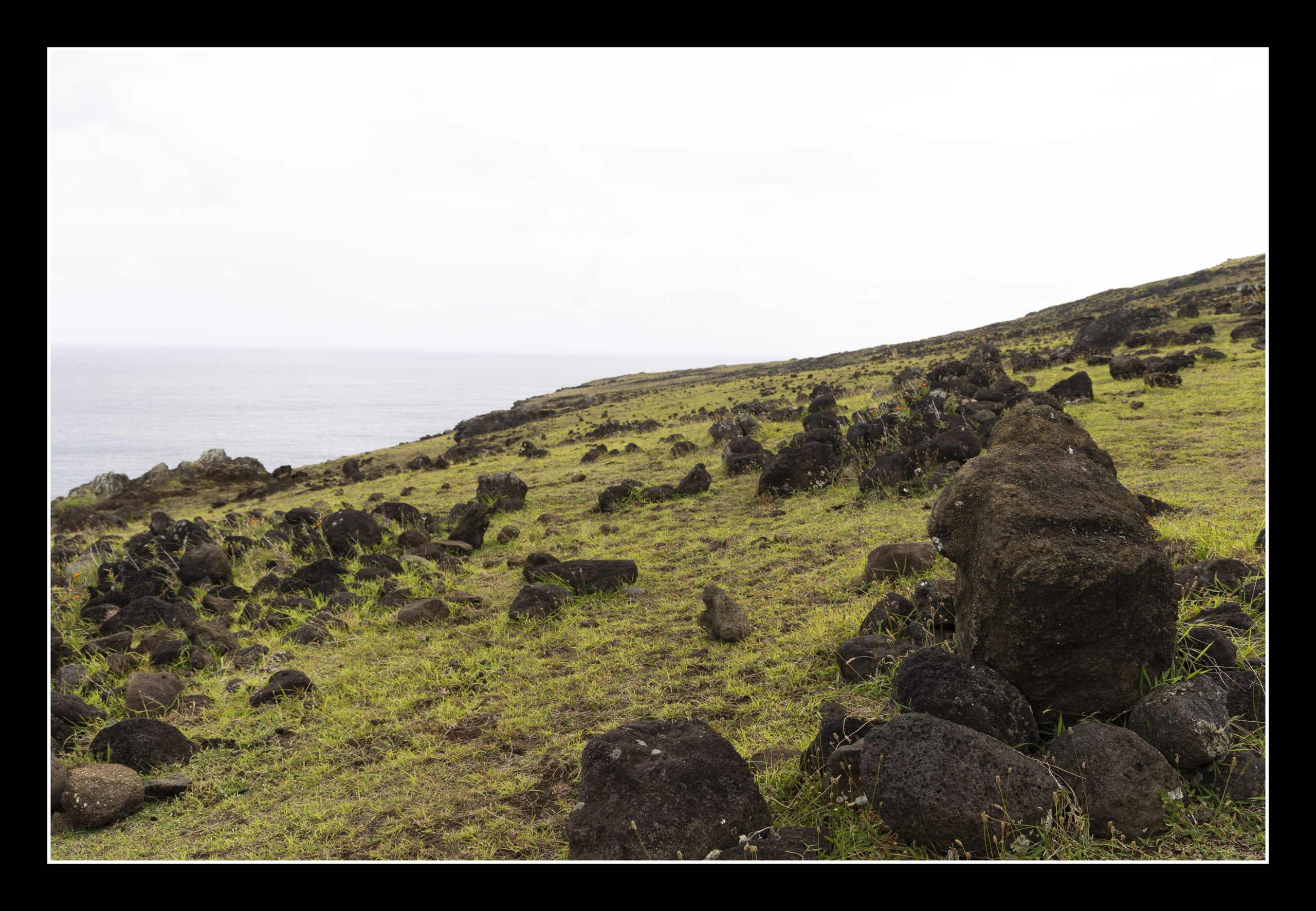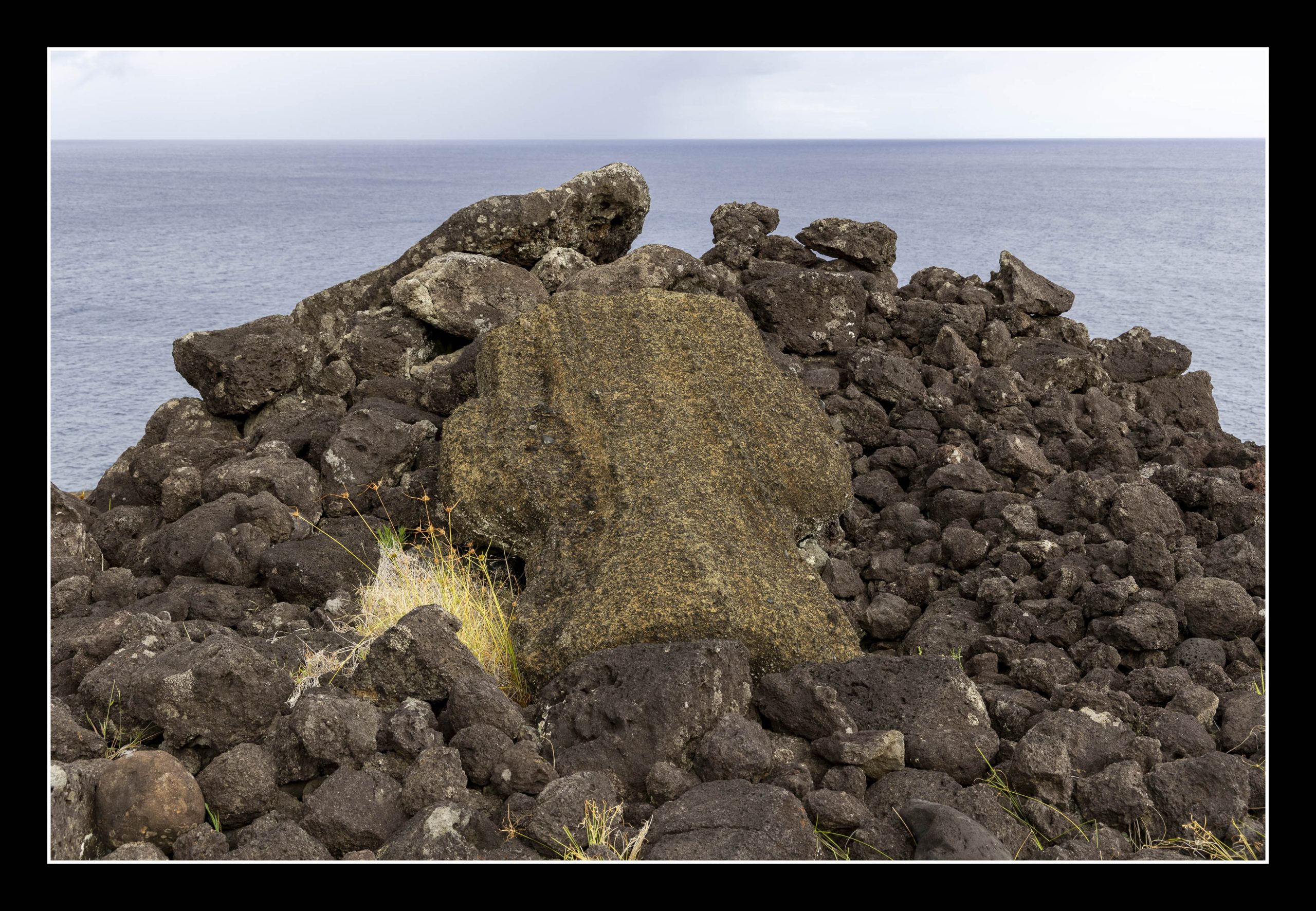 In today’s post you and I continue to explore Rapa Nui physically and culturally. One of the joys of travel is being party to happy serendipitous events. One of those events led to a walk with the guide from earlier on in the week, his 9 year old daughter, a female tugboat captain from Nova Scotia, and I walking the seldom visited wild north shore of Rapa Nui. The only access is via foot. It is a point to point walk, and therefore once started there is no turning back. Our guide’s daughter who is already learning to free dive walked most of the 17km trail in flip flops. The path goes by a pineapple farm, crosses fields of volcanic rock (some with remnants of human markings), by moai that came off their platforms centuries ago, and into caves with carvings of Makemake.