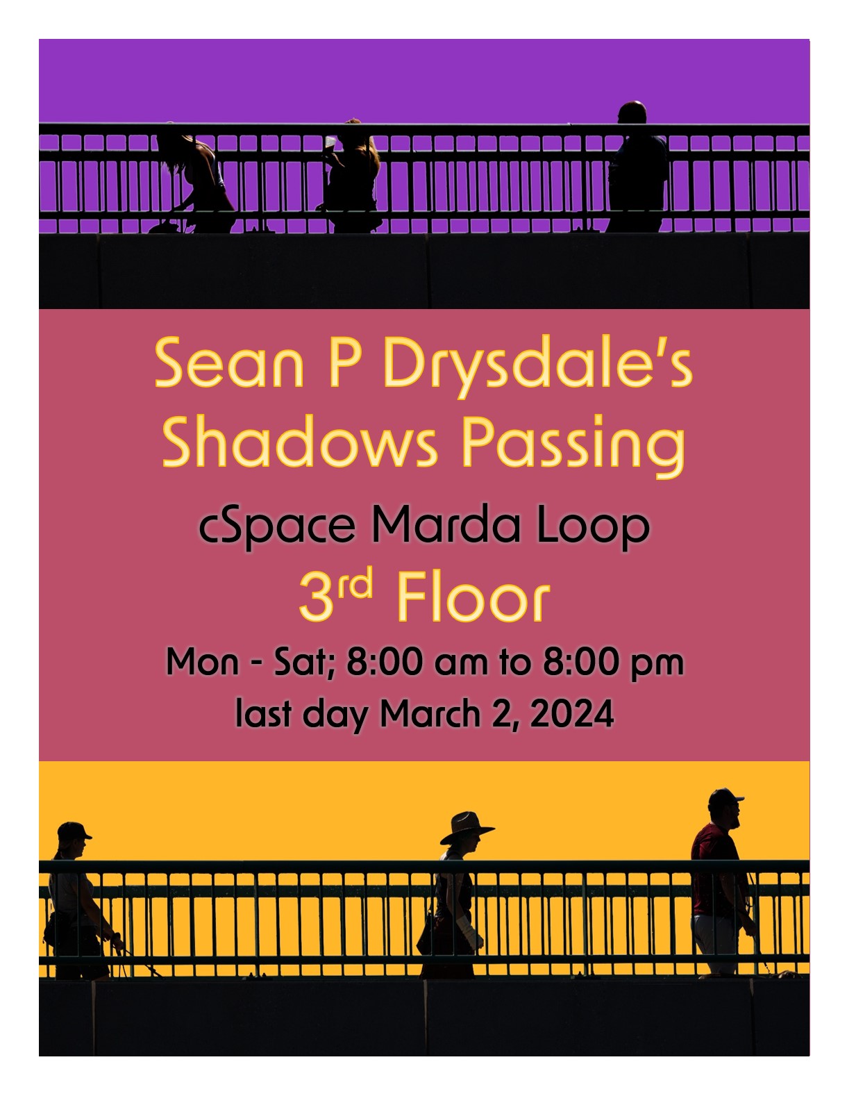 Shadows Passing was displayed in February 2024 at cSPACE – Marda Loop, Calgary as two different expressions of the same original forty-five digital photographs. Those photographs were chosen from thousands captured during multiple visits to multiple locations. In the end only photographs from a single location were used. Each of the forty-five original photographs were modified in two different ways to form two groups of thirty-nine images and two groups of six images. Each of the two 39 image sets were displayed as 3 rows of 13 images to form a visual field approximately 1m (39”) high x 5.7 m (12’ 8”) wide. Each image was 9” high x 12” wide and framed without glass (12 5/8” x 15 5/8”).