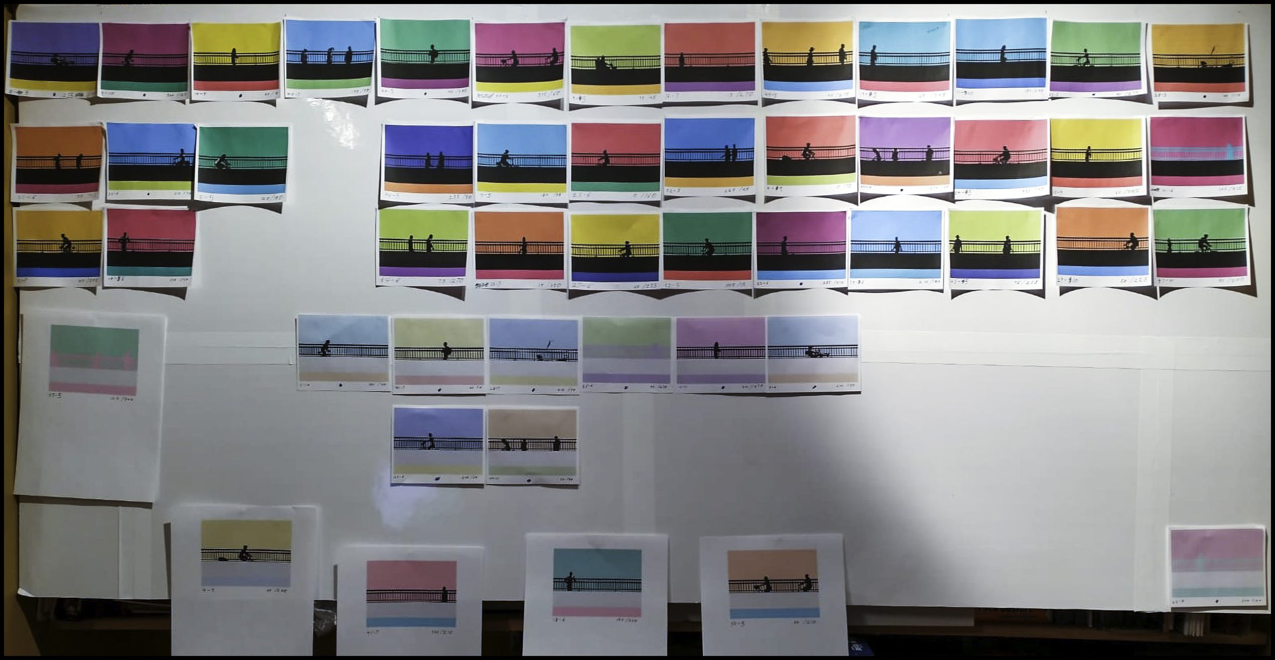 “Shadows Passing” was initially envisaged as a series of black and white silhouettes centred around a visual response to our apparent contradictory desire to be both connected to others and to be left alone. Though this thought never vanished, as I bumbled my way through various constraints and explorations, familiar and previously unarticulated ideas emerged. Explorations included colour theory, along with conscious and unconscious references to 20th Century art.